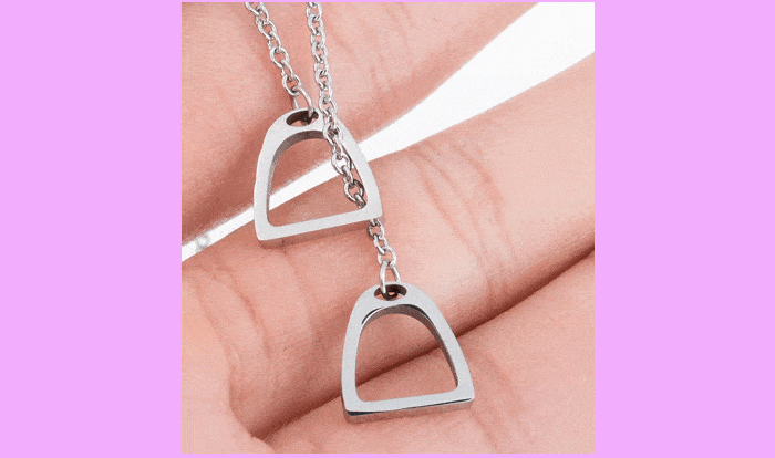 This dainty silver necklace features to tiny English riding stirrups on an elegant 19" chain. The easy-to-open lobster claw clasp makes putting on and taking off a very easy process, even for little hands.